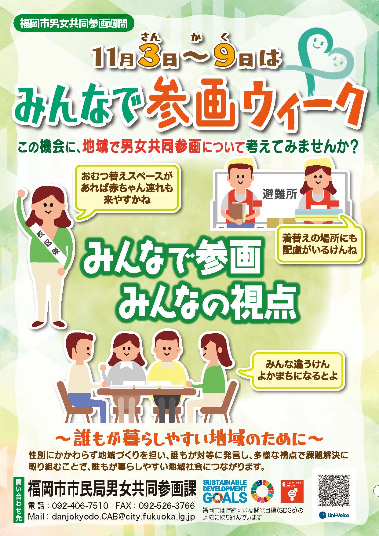「みんなで参画ウィーク」は、様々な地域団体の枠を超えて市民の皆さんに男女共同参画について考えてもらうきっかけづくりとして、男女共同参画基本計画(第2次)の策定時に、地域の皆様からいただいたご意見をもとに創設された福岡市独自の週間です。(平成23年度開始)